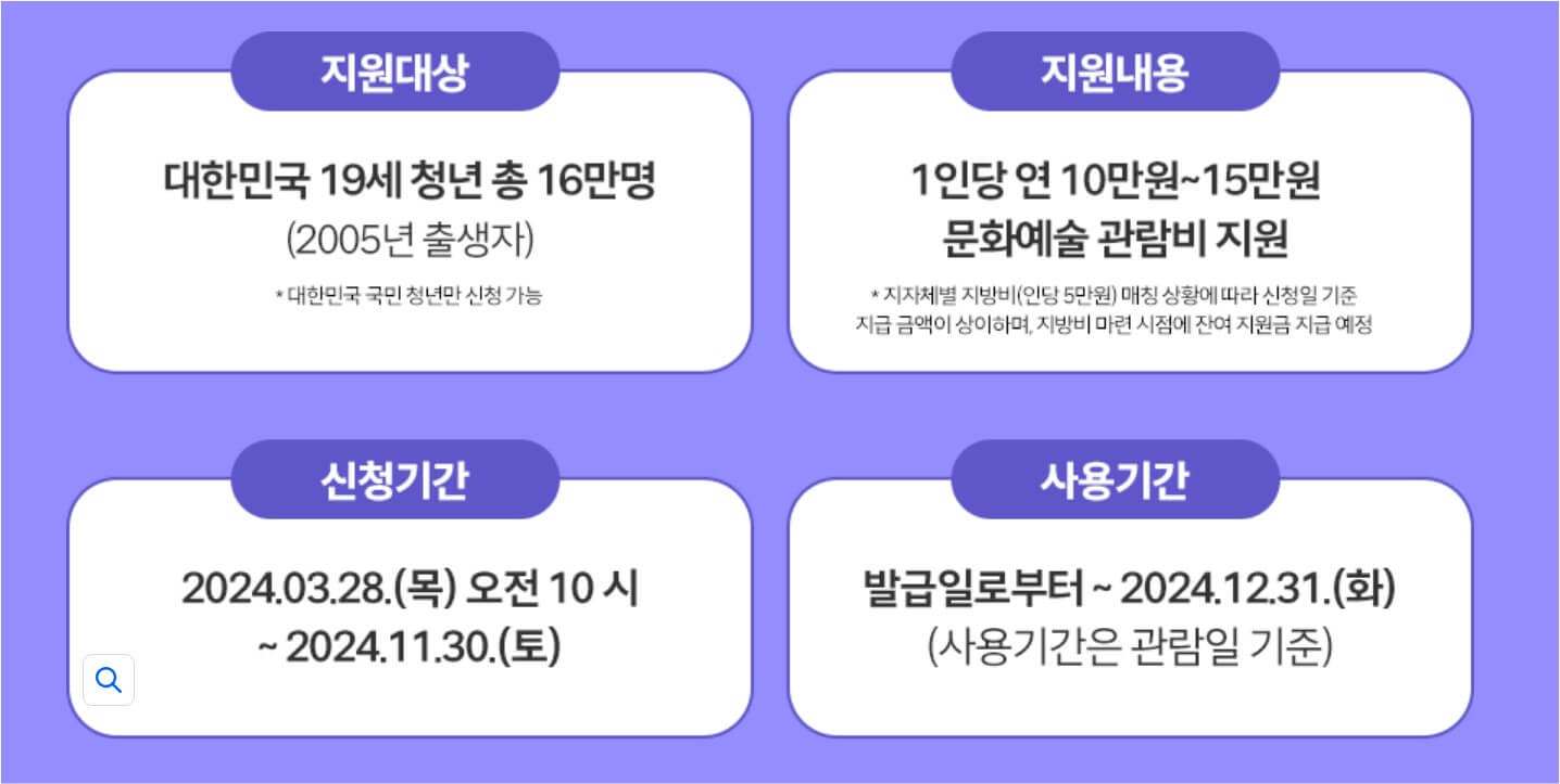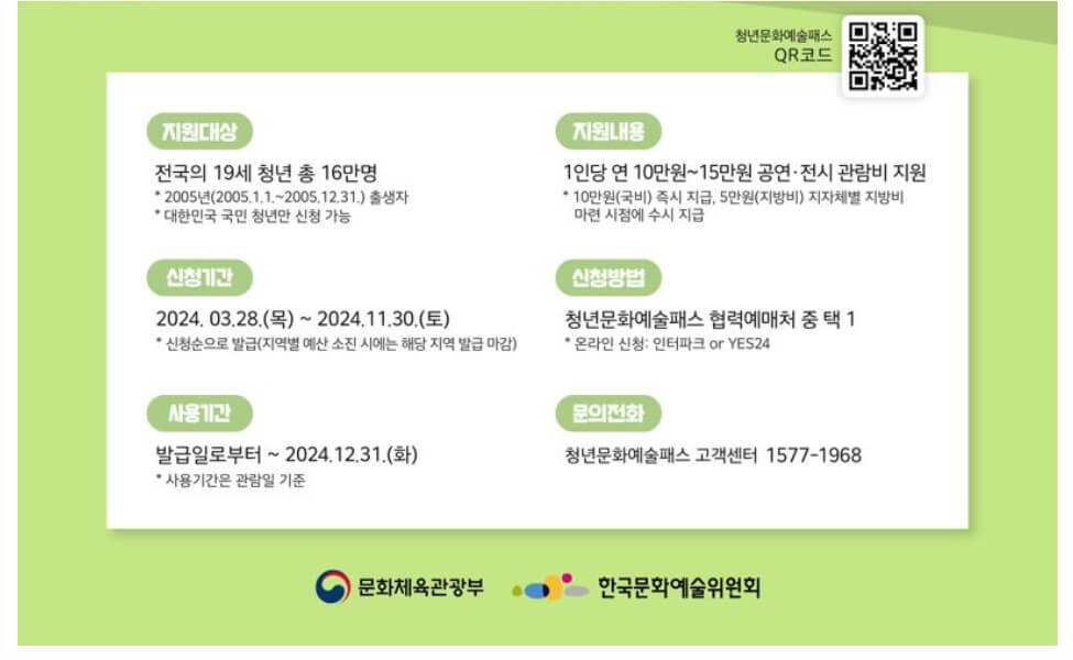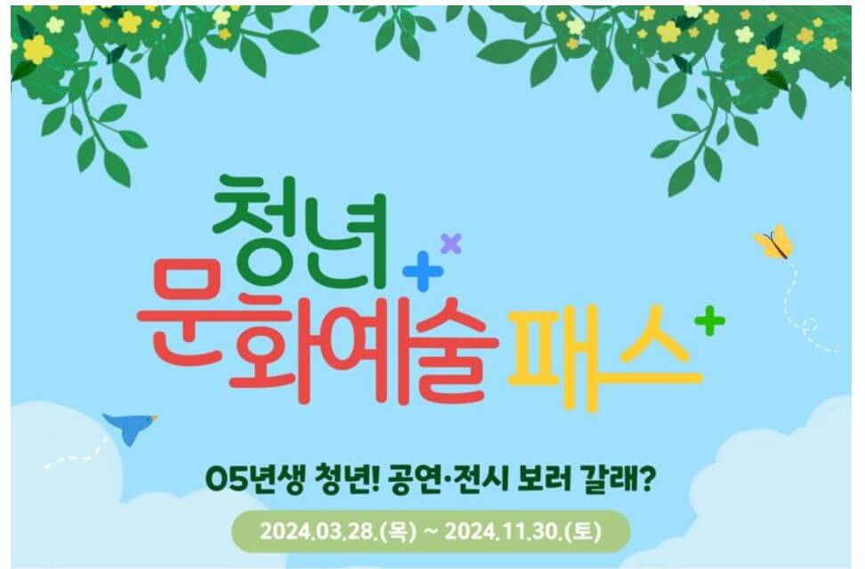 문화체육관광부와 한국문화예술위원회에 따르면 2005년생 청년(19세) 들을 대상으로 뮤지컬, 연극, 무용, 클래식 등 공연과 전시 관람에 사용할 수 있는 '청년문화예술패스'를 3월 28일부터 신청가능 합니다.