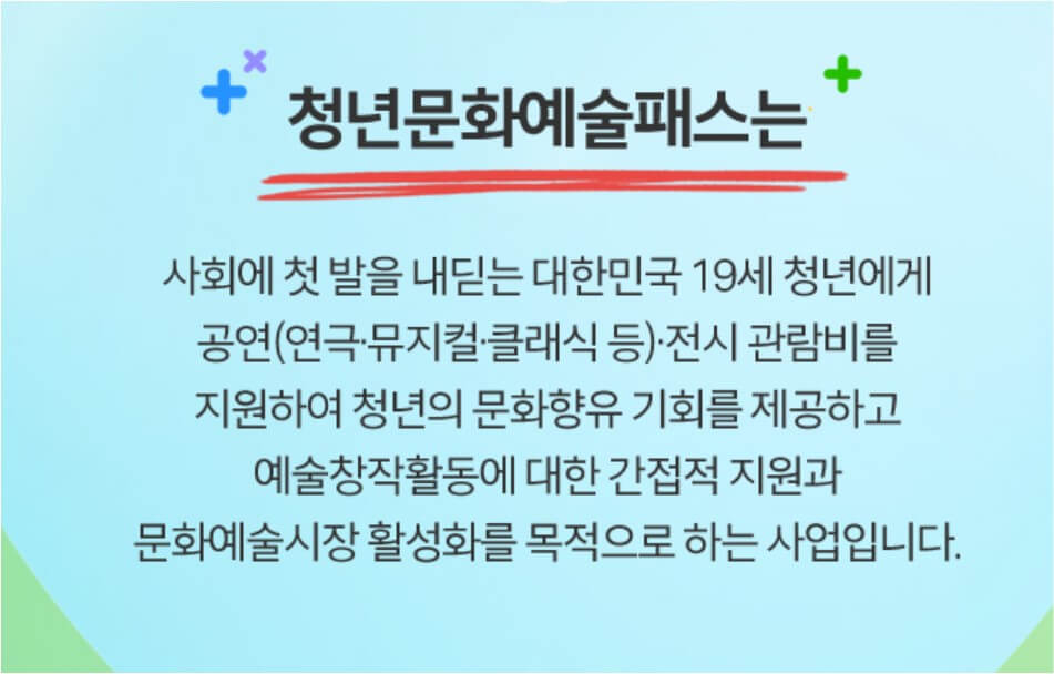 문화체육관광부와 한국문화예술위원회 주관으로 사회에 첫 발을 내딛는 대한민국 19세 청년에게 공연(연극, 뮤지컬, 클래식 등) 전시 관람비를 지원하여 청년의 문화향유 기회를 제공하고 예술창작활동에 대한 간접적 지원과 문화예술시장 활성화를 목적으로 하는 사업입니다.