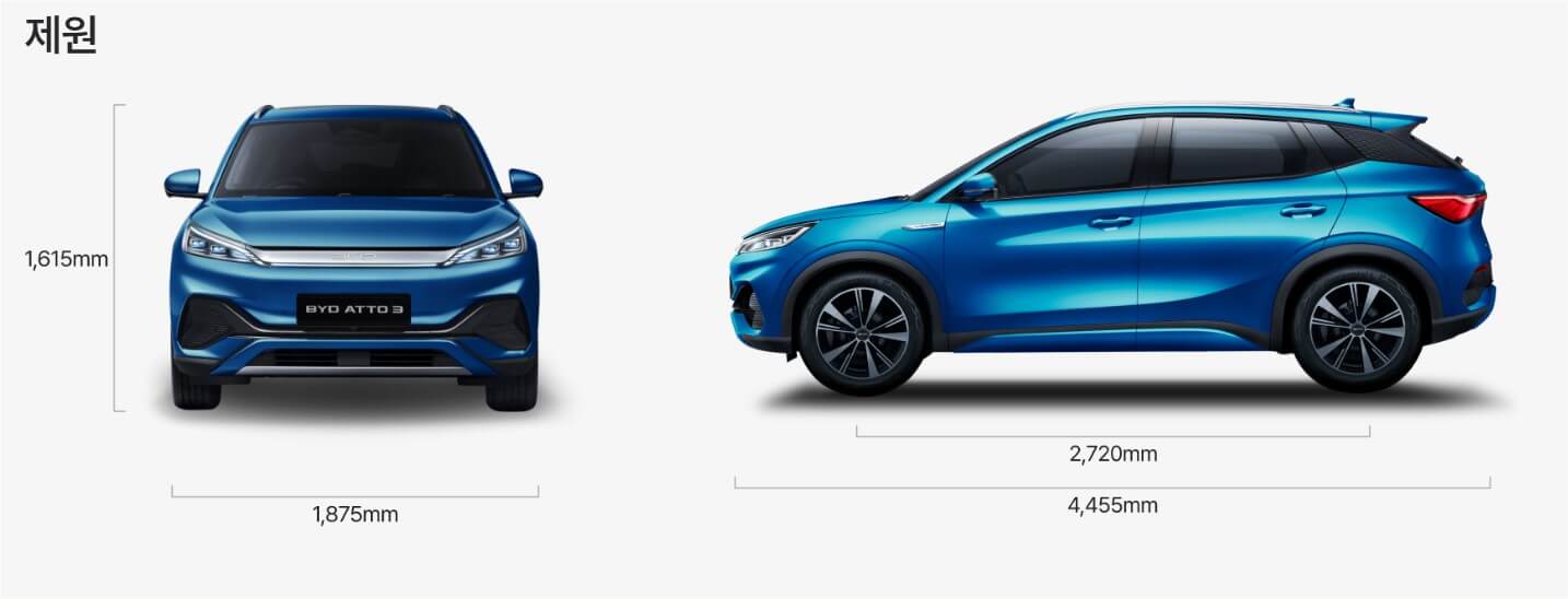 BYD 아토3는 소형 SUV 중에서도 큰 차체 크기를 자랑합니다. 전장 4,455mm, 전폭 1,875mm, 전고 1,615mm, 휠베이스 2,720mm의 크기로, 넓은 실내 공간을 제공합니다. 성능 면에서도 주목할 만한 수치를 보여줍니다.